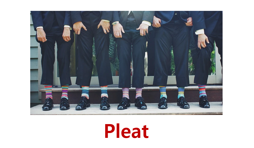 마지막으로 알아볼 단어는 바로 pleat입니다. 보통 수트 바지에 있는 주름을 지칭하는데요, 아예 주름이 없는 디자인의 바지도 있고, 혹은 앞뒤로 굵은 주름이 져 있는 바지도 존재합니다. 이럴 때 주름을 pleat이라고 지칭하면 된답니다. pleat역시 vent와 마찬가지로 single pleat, double pleat으로 나뉘기도 합니다. 바로 영어 예문 알아볼까요?