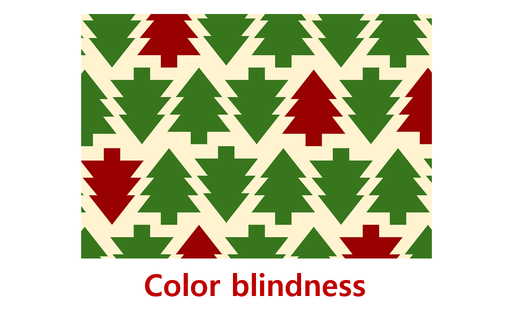 두 번째 단어는 색맹입니다. 색맹도 시각 장애 중 하나라고 할 수 있는데요, 특정한 색이 구분이 안되거나 원래 색과 다르게 보이는 것을 의미합니다. 색맹은 영어로 color blindness라고 표현하는데요, 사실 색맹 안에서도 많은 종류들이 있기 때문에 상황에 따라서 유연하게 사용할 수 있는 단어랍니다. 신기한 점은 여성보다 남성에서 색맹의 비중이 높고, 또한 백인들이 다른 인종보다 색맹의 비율이 높다고 하네요! 영어 예문으로 공부해볼까요?